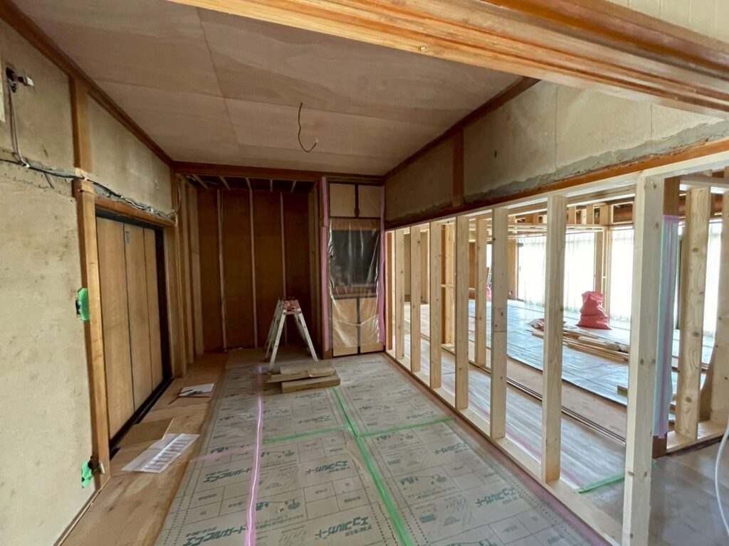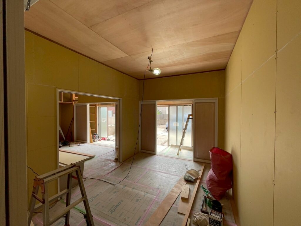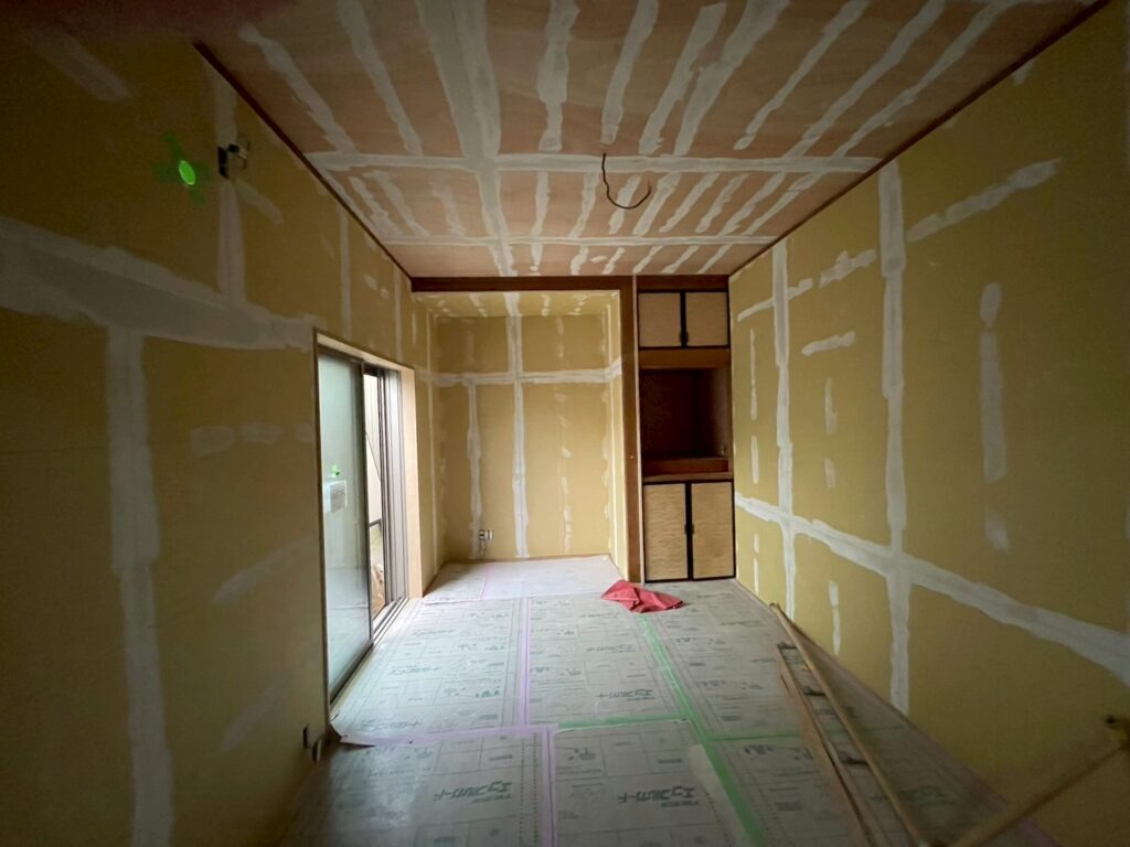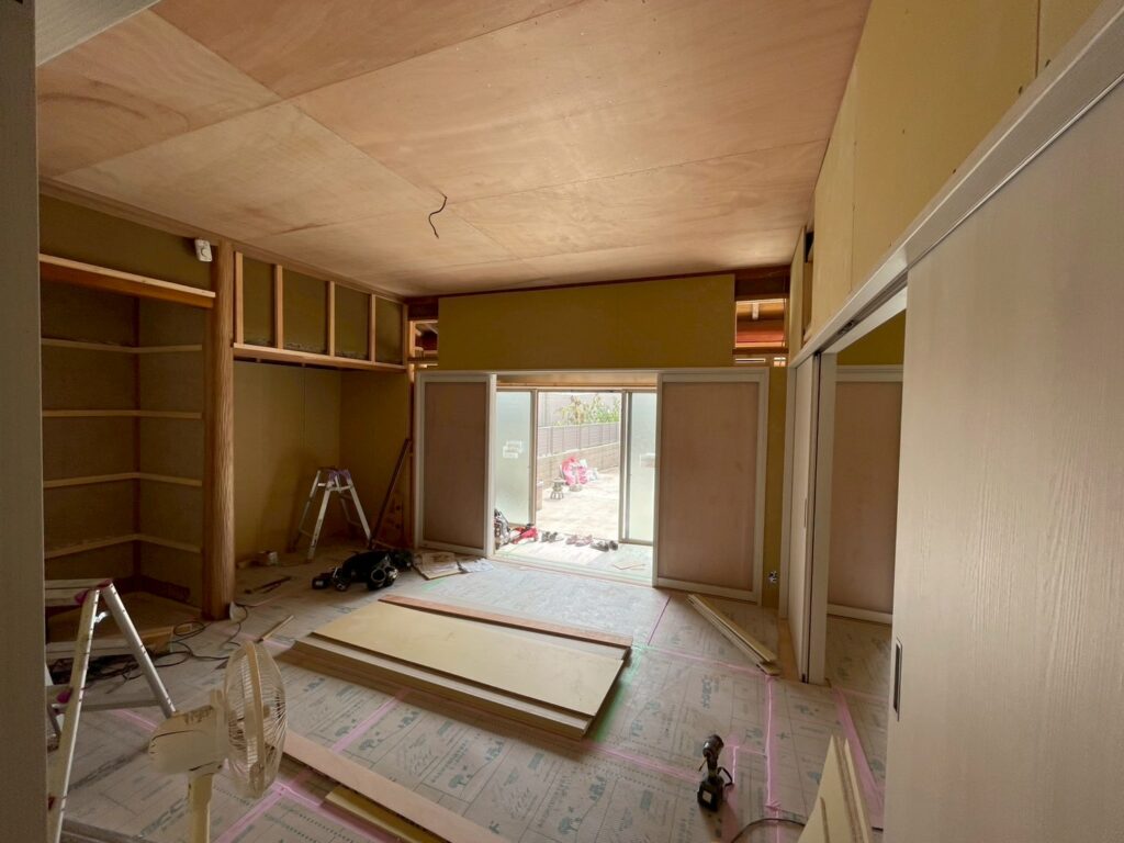 1Fの和室全てフローリングに貼替、壁を作って部屋を仕切り、クロスで仕上げていきます。
